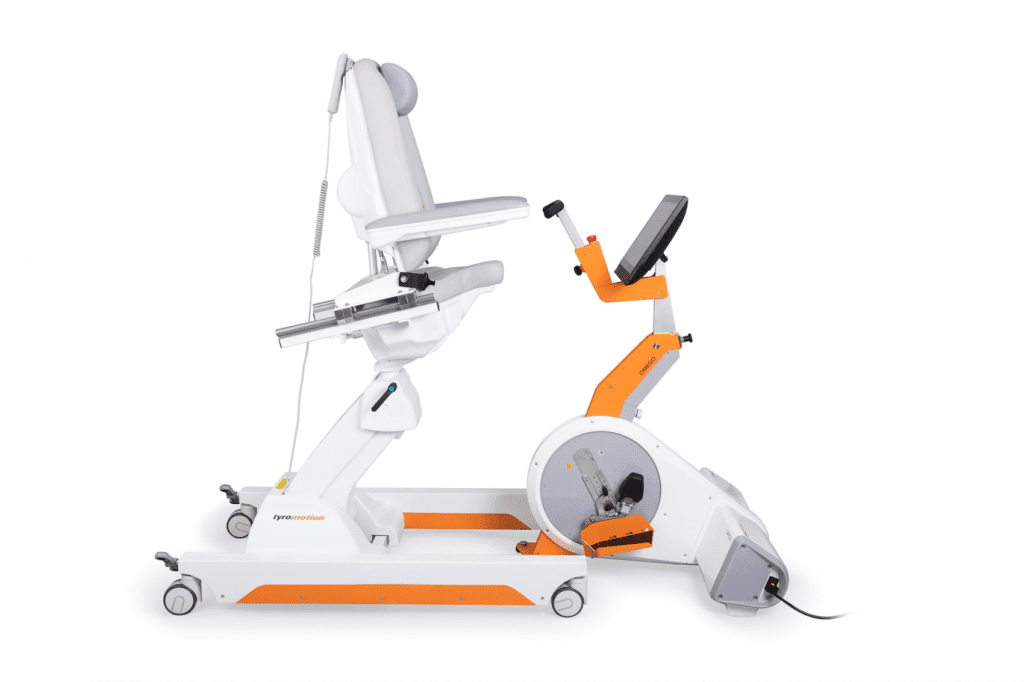 OMEGO, developed by Tyromotion, is a robotic therapy system designed for individuals with lower limb functional limitations. It supports rehabilitation by providing a range of training modes that target gait-related components such as strength, range of motion, coordination, rhythm, symmetry, and proprioception. The device includes multiple exercise options, such as stepping, cycling, leg press, ankle training, and sensory training, allowing therapy to be tailored to individual needs. OMEGO also integrates visual feedback and interactive elements to enhance engagement and enable monitoring of performance and progress over time. It can be used throughout different stages of rehabilitation as part of inpatient, outpatient, or intensive programmes.