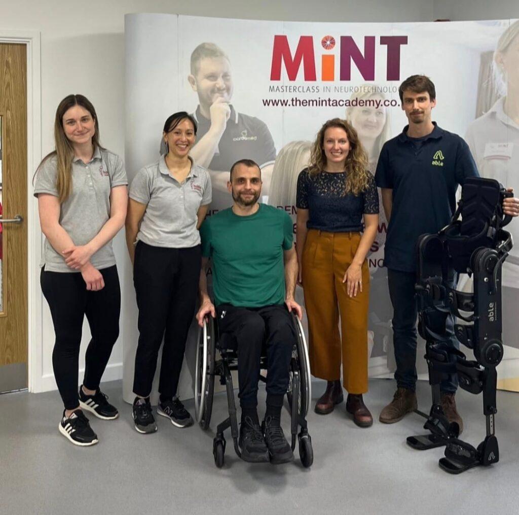 Expert patient Iwan with Hobbs Rehabilitation specialist neurological therapists and the creators of the ABLE exoskeleton